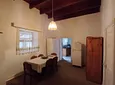 A large dining room with the same beautiful wooden ceiling, creating a warm and inviting atmosphere.